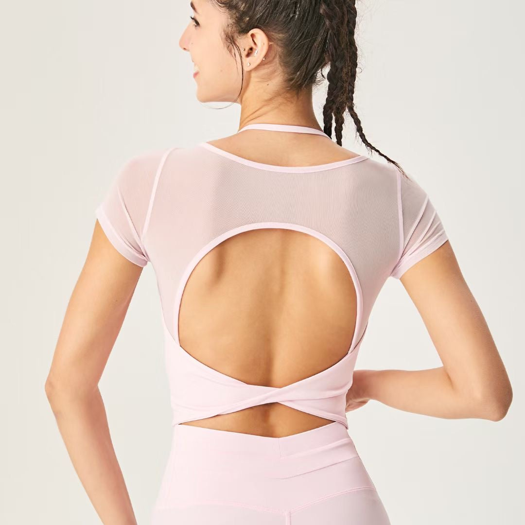 Elevate your activewear with this versatile sheer top designed to keep you comfortable and confident. The cap sleeves offer gentle coverage while the inbuilt halter sports bra provides reliable support for your workouts. A striking back cutout with an elegant twist detail adds visual interest, while the broad waistband in front creates a flattering silhouette that supports your natural shape. Perfect for yoga, gym sessions, or casual wear, this piece combines functionality with contemporary style.