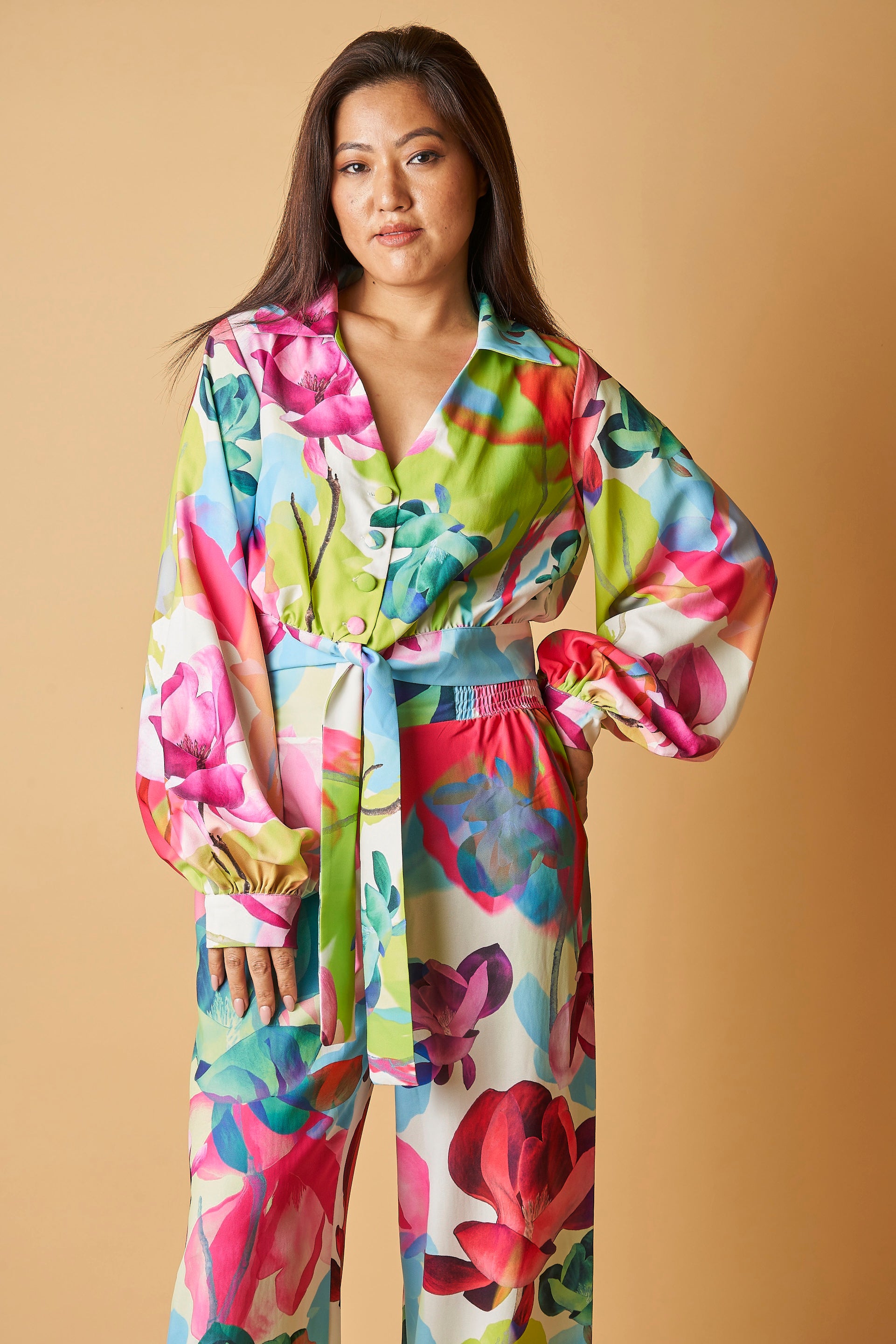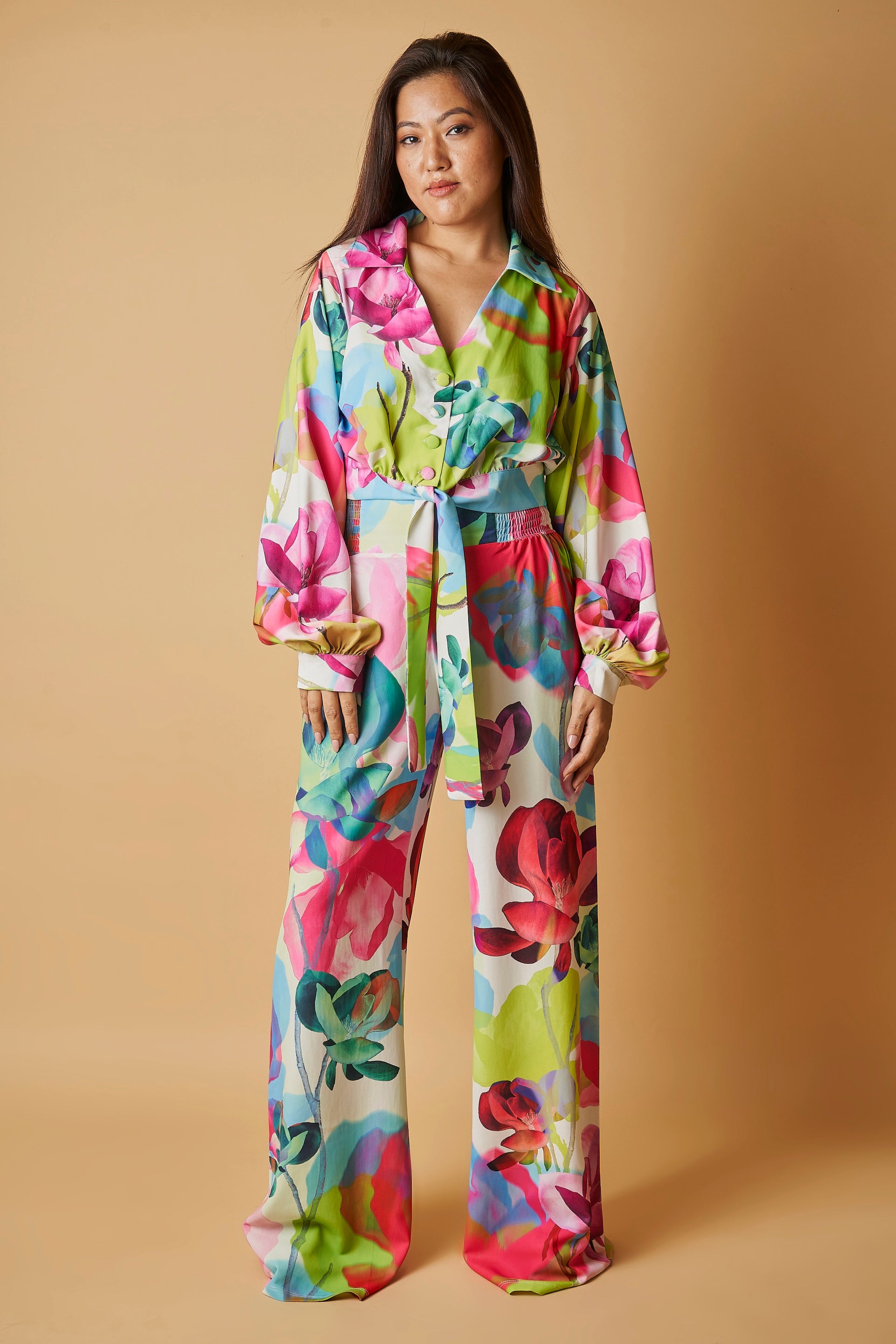 Coord set with bishop sleeves. Collared V-neck top with front button detail and a waist tie. Full length loose pants with elastic waist.
