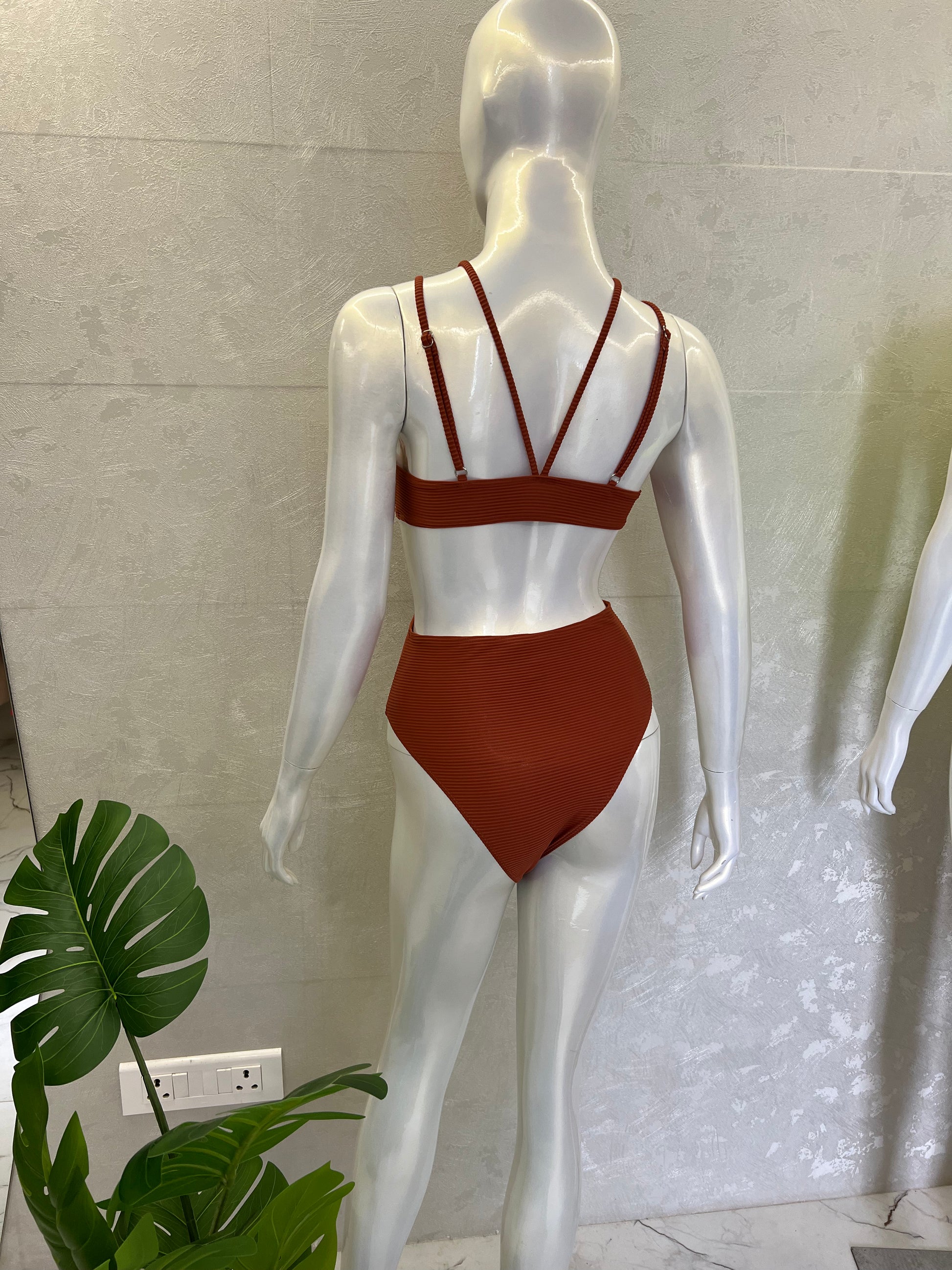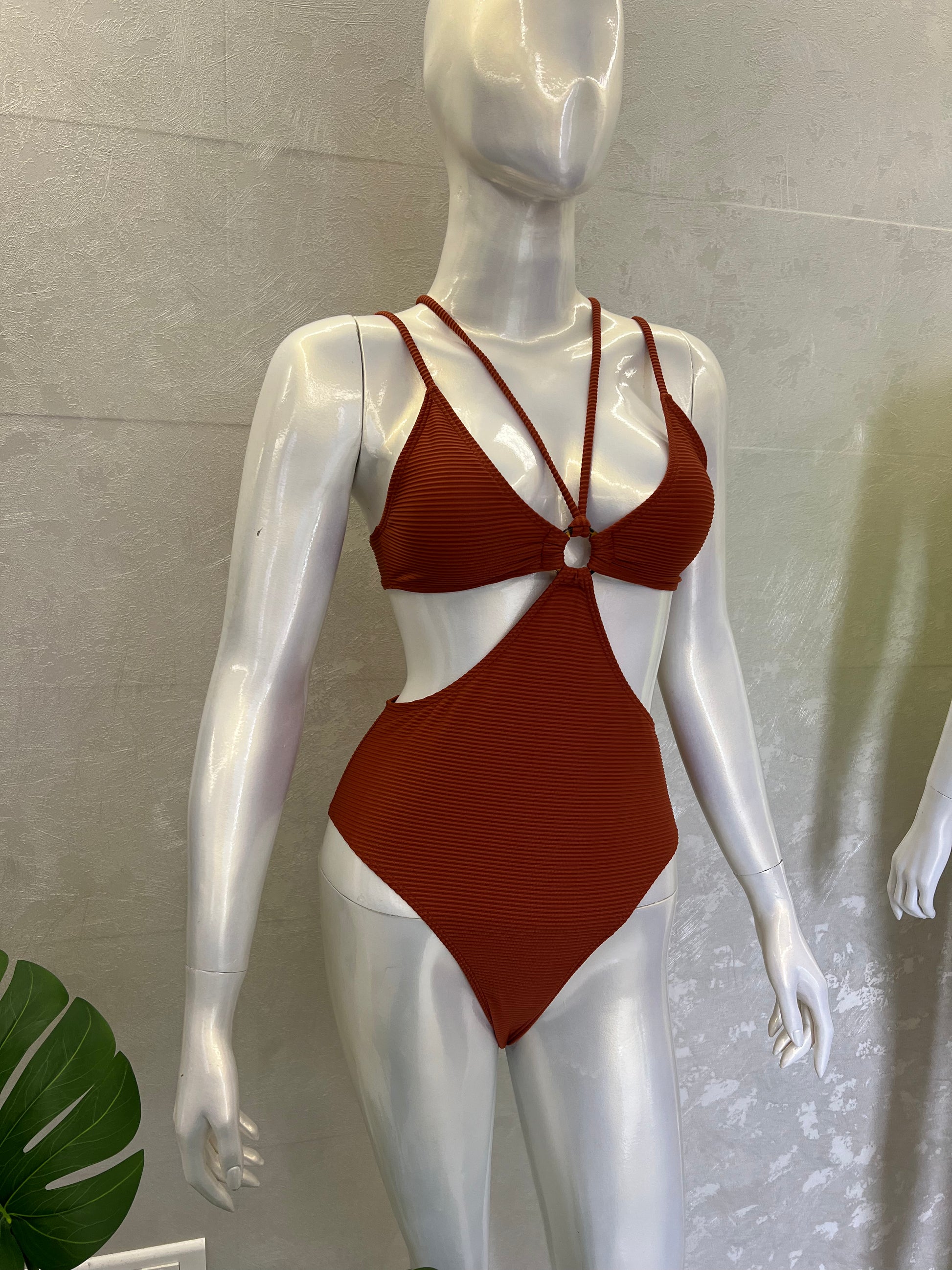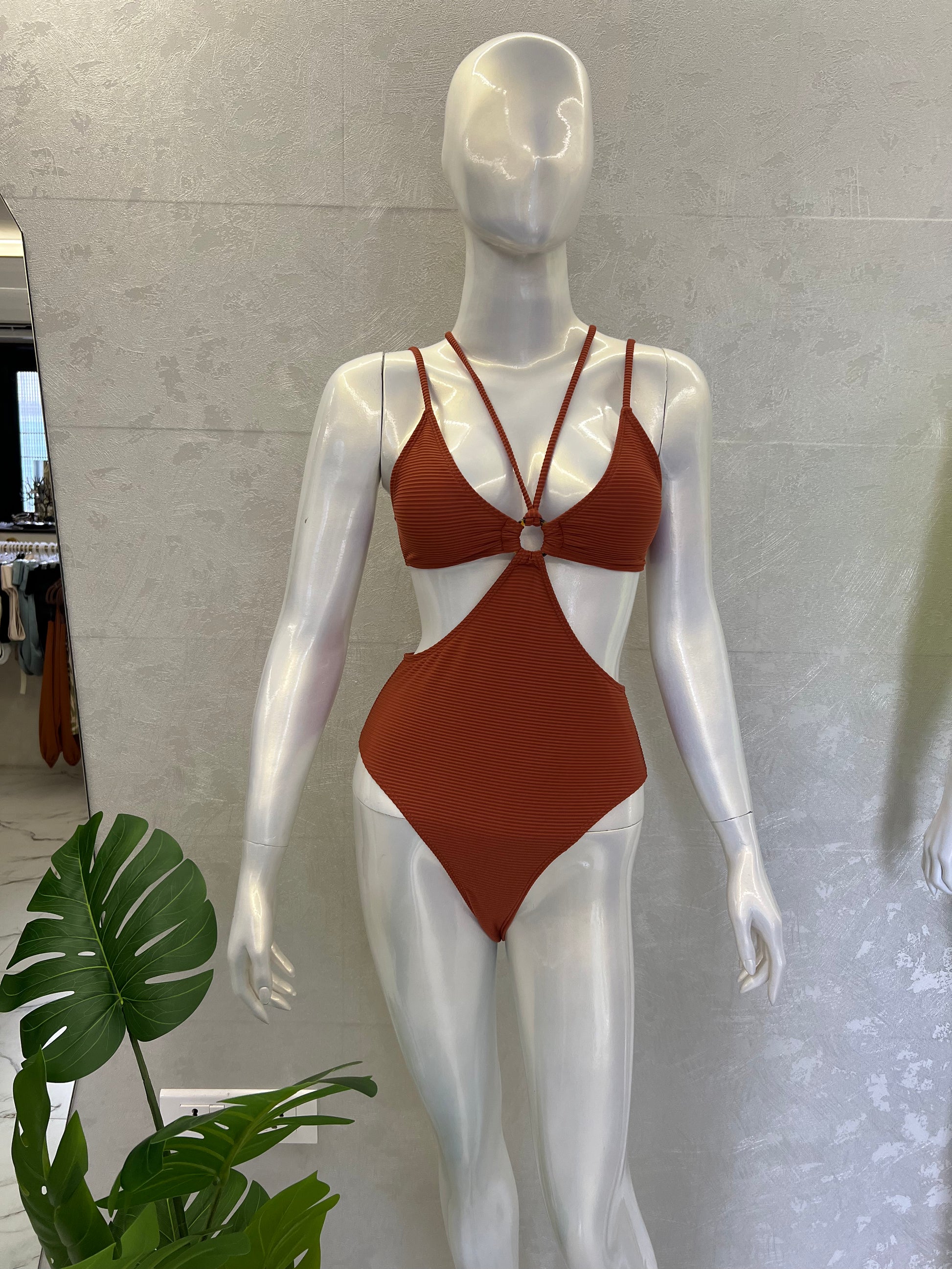 Swimsuit with thin strap details and a V neckline. Removable cups for support and shape. Cutout sections at the waist with ring at the centre of the bust.